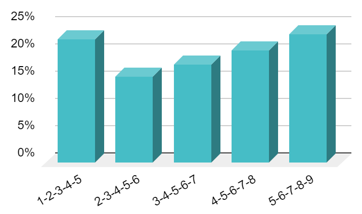2468 and 13579 were about the same with ~9.7% of winning hands, while the 2023 section, Any Like Numbers and 369 were around ~5.7%, give or take.